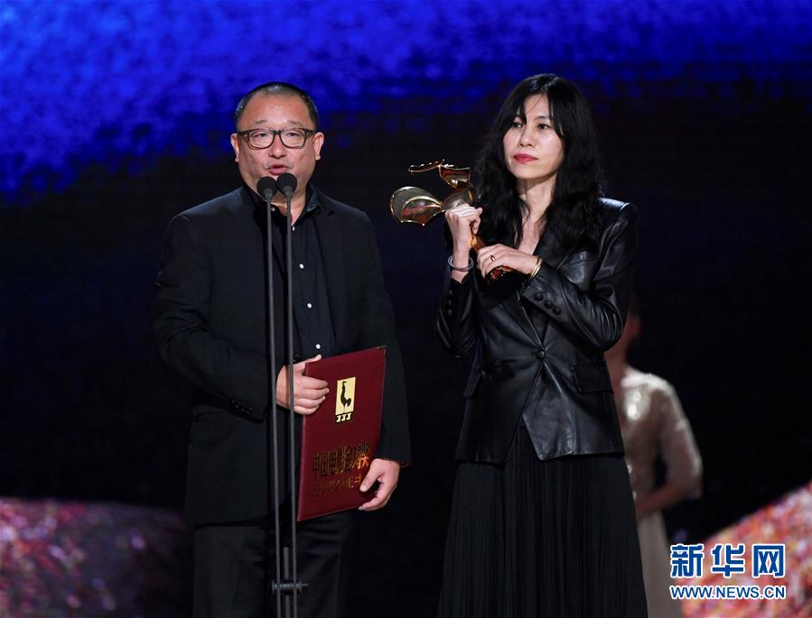 11月23日,電影《地久天長》獲得最佳編劇獎(jiǎng),導(dǎo)演兼編劇王小帥(左)、編劇阿美在頒獎(jiǎng)儀式上。 當(dāng)日,第32屆中國電影金雞獎(jiǎng)?lì)C獎(jiǎng)典禮在福建廈門舉行。 新華社記者姜克紅攝