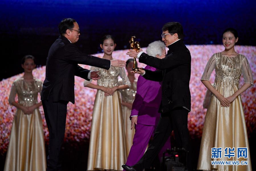 11月23日,電影《流浪地球》獲得最佳故事片獎(jiǎng),成龍?jiān)跒殡娪俺銎贩酱眍C獎(jiǎng)。 當(dāng)日,第32屆中國電影金雞獎(jiǎng)?lì)C獎(jiǎng)典禮在福建廈門舉行。 新華社記者 姜克紅 攝