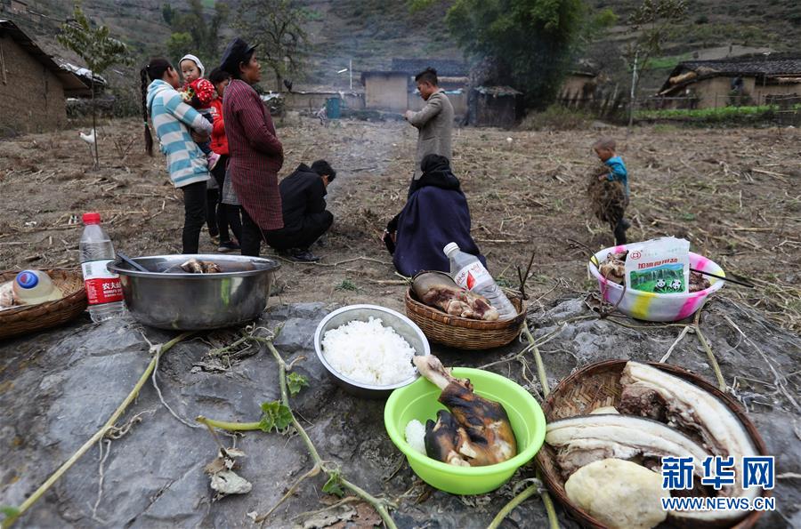 11月24日,在昭覺(jué)縣支爾莫鄉(xiāng)阿土列爾村,當(dāng)?shù)鼐用駵?zhǔn)備熟食、酒等食物祭祖,并相互贈(zèng)送。11月20日至26日是四川省涼山彝族自治州大小涼山彝族群眾傳統(tǒng)節(jié)日——彝族年,懸崖上的阿土列爾村的彝族群眾殺年豬、祭祀和走親拜年,慶祝一年一度的彝族年。阿土列爾村是“懸崖村”,位于四川省涼山彝族自治州昭覺(jué)縣支爾莫鄉(xiāng),坐落在海拔1400-1600米山坳中,這里居住著60多戶彝族群眾,村民走出大山,需要攀爬懸崖。新華社記者江宏景攝