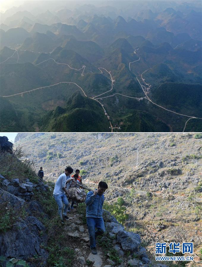 拼版照片:上圖為已經(jīng)通路的大化瑤族自治縣七百弄鄉(xiāng)弄雄村弄桃屯以及周邊村屯(11月10日無人機拍攝);下圖為在尚未通路的弄雄村弄桃屯,村民抬著準(zhǔn)備出售的土豬走在山路上(2016年12月8日攝)。新華社記者黃孝邦攝