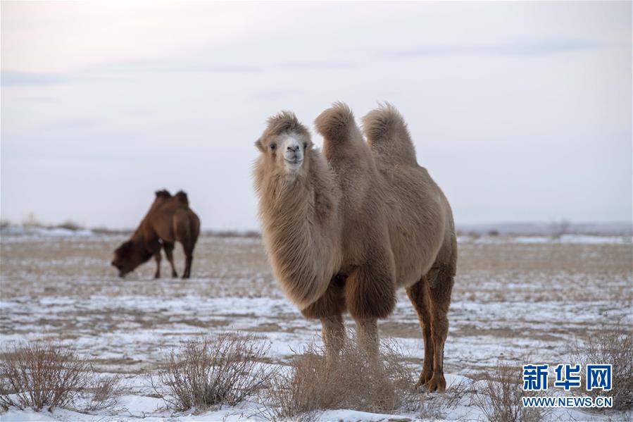 11月24日,兩峰駱駝在新疆吉木乃縣“萬駝園”覓食。新華社記者沙達(dá)提攝