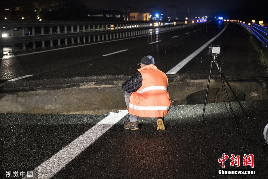 當(dāng)?shù)貢r(shí)間2019年11月24日,意大利Villafranca dAsti,意大利遭受惡劣天氣和持續(xù)多日的暴雨,通往都靈方向的A21高速公路路面出現(xiàn)“大坑”。圖片來(lái)源:視覺中國(guó)