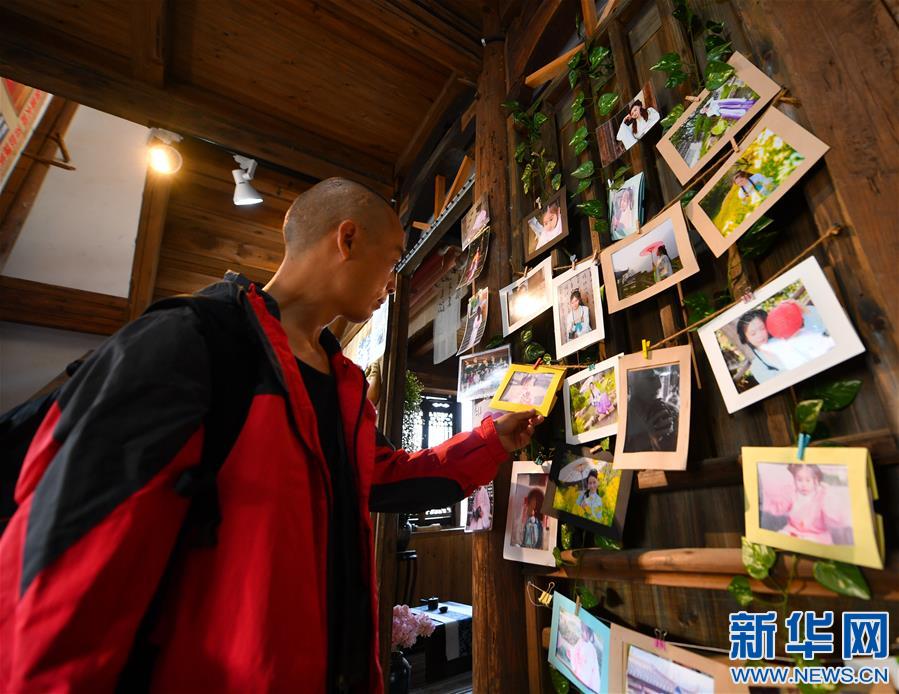 曹加祥在篁嶺村的攝影吧內(nèi)欣賞其他游客拍攝的圖片(11月6日攝)。新華社記者胡晨歡攝