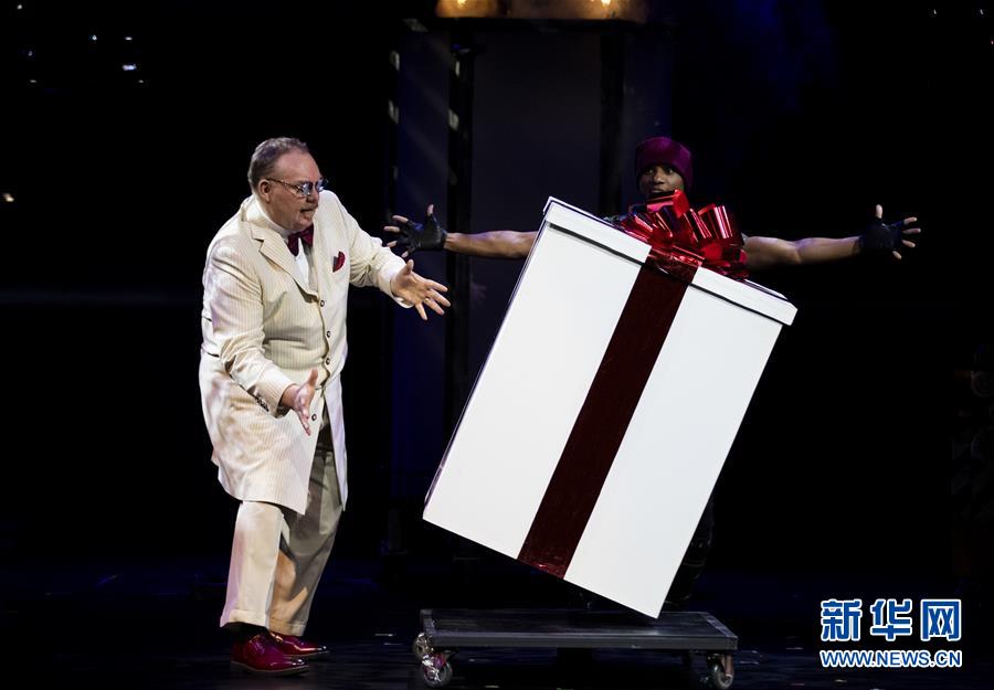 12月3日,在美國(guó)紐約,魔術(shù)師凱文·詹姆斯(左)在“魔術(shù)師——假日魔法”媒體秀上表演。新華社記者王迎攝
