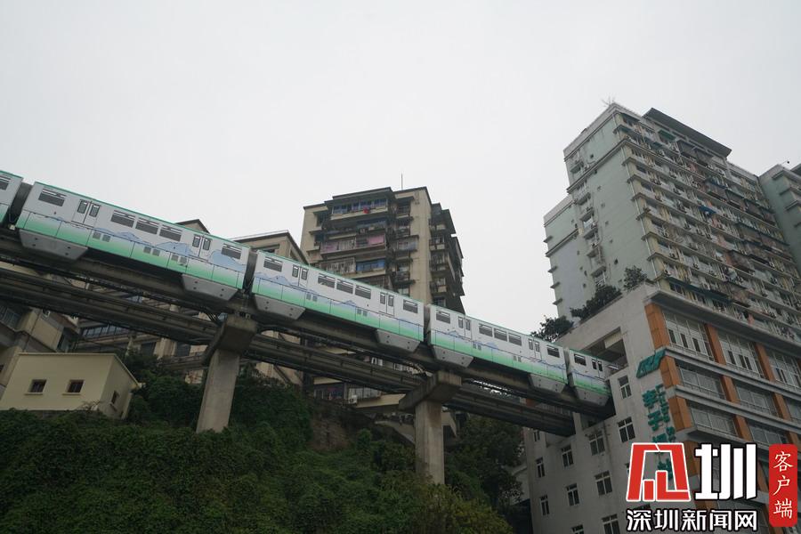 2019年6月25日,重慶渝中區(qū),軌道交通2號(hào)線列車從一小區(qū)的6層“螺旋”停車場(chǎng)上方穿過,顯得十分“魔幻”。圖為高處拍攝的軌道交通2號(hào)線。
