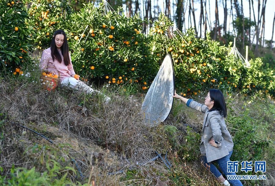 李柳萍(左)和員工在果園里拍攝鹿寨蜜橙宣傳片(12月9日攝)。新華社記者黃孝邦攝