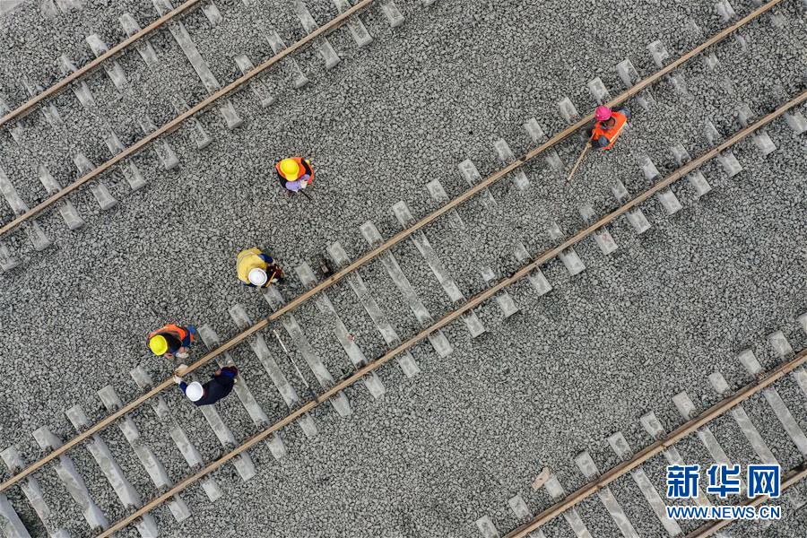 12月17日,中鐵八局建設(shè)者們在改貌鐵路口岸施工(無人機拍攝)。 新華社記者 劉續(xù) 攝