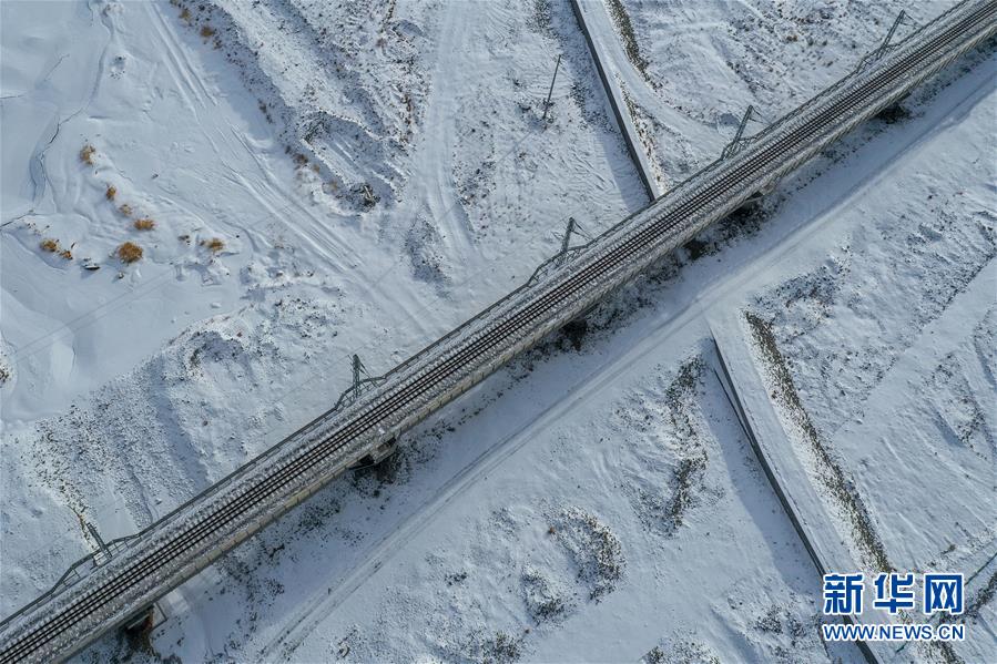 這是12月16日無人機拍攝的敦煌鐵路大柴旦站附近的一處鐵路橋。新華社記者張龍攝