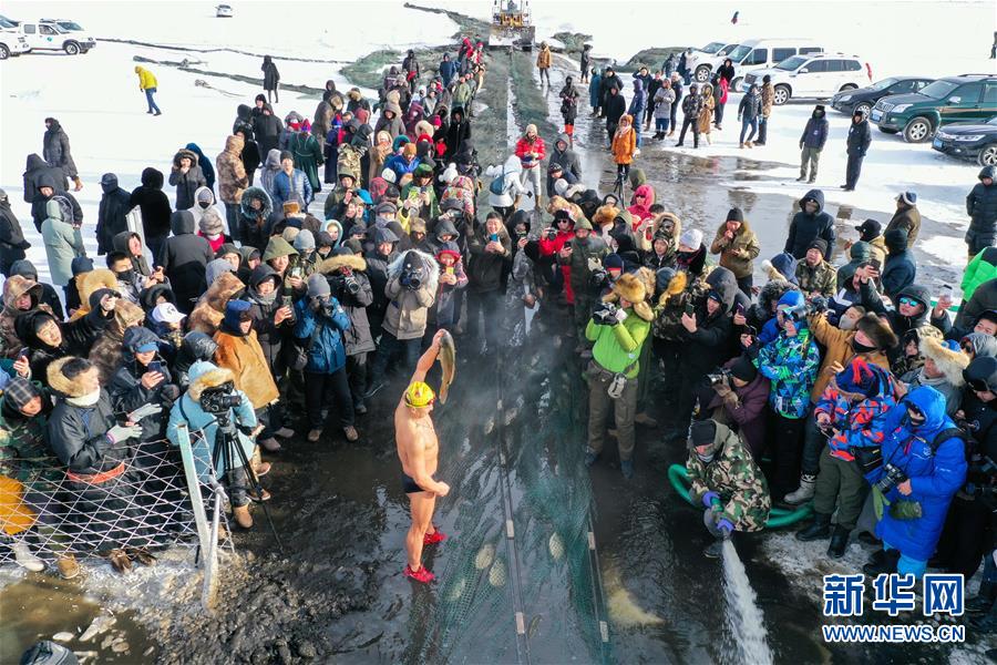 12月18日,一名冬泳愛好者展示冬捕魚(無人機拍攝)。新華社記者劉磊攝