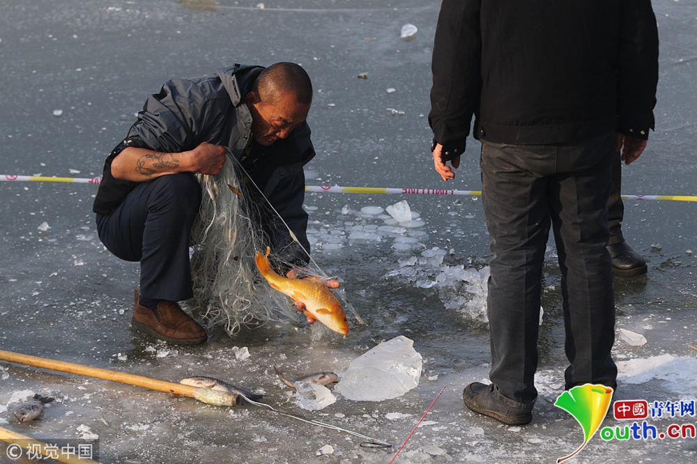 哈爾濱松花江封江市民鑿冰捕魚(yú)