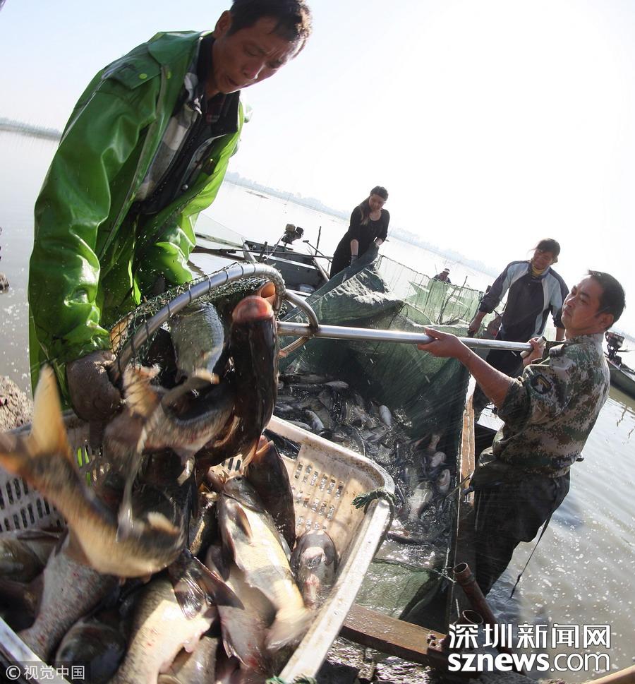 江蘇揚州,漁夫?qū)Ⅳ~撈出過秤。