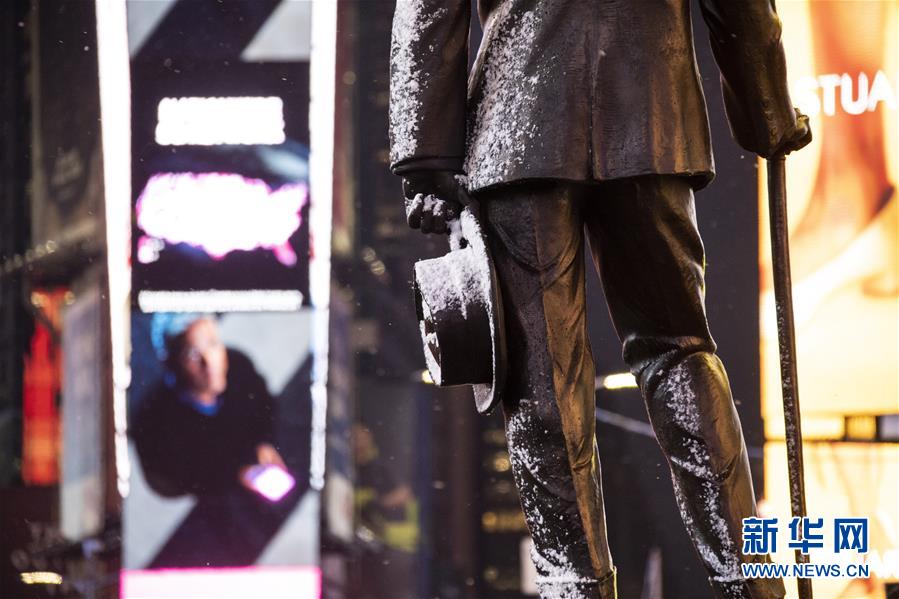 12月18日,美國紐約時(shí)報(bào)廣場(chǎng)上的雕像落上積雪。新華社記者 王迎 攝