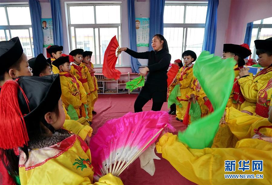 12月19日,河北省灤州市小閆營(yíng)小學(xué)學(xué)生在排練地秧歌。