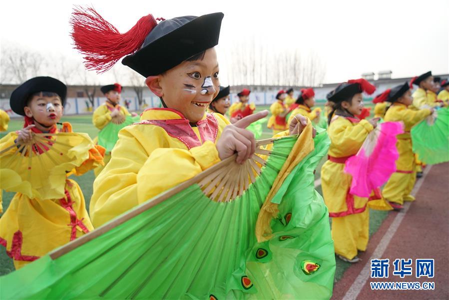 12月19日,河北省灤州市小閆營小學(xué)學(xué)生在排練地秧歌。新華社記者 牟宇 攝