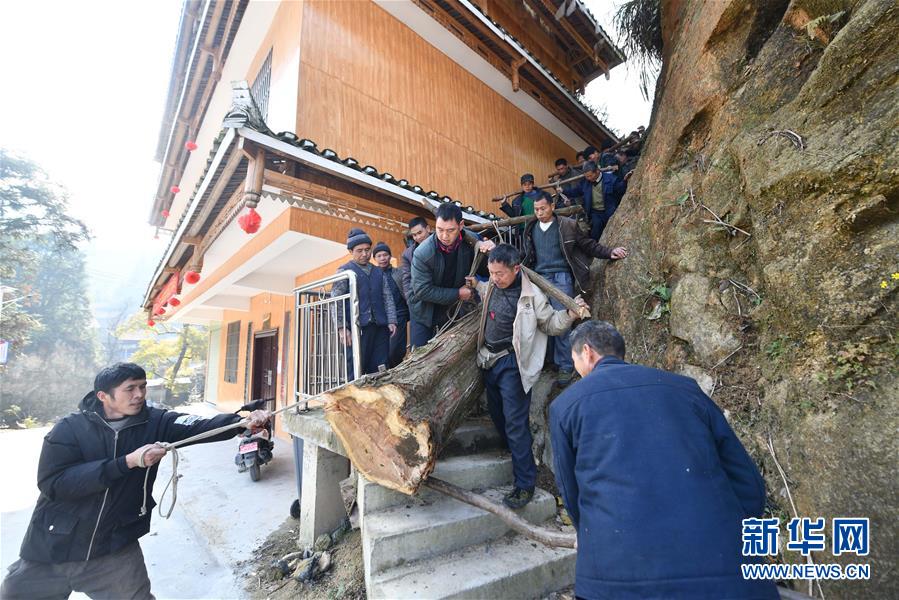 烏英苗寨村民合力抬木頭下山,準備制作蘆笙柱(12月2日攝)。新華社記者黃孝邦攝