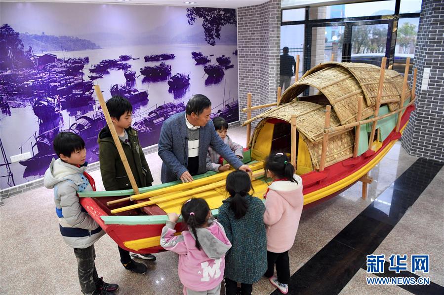寧德福安市溪邳村黨支部書記江寬全在村展覽館向村里兒童介紹老一輩船民的海上生活(3月7日攝)。新華社記者姜克紅攝