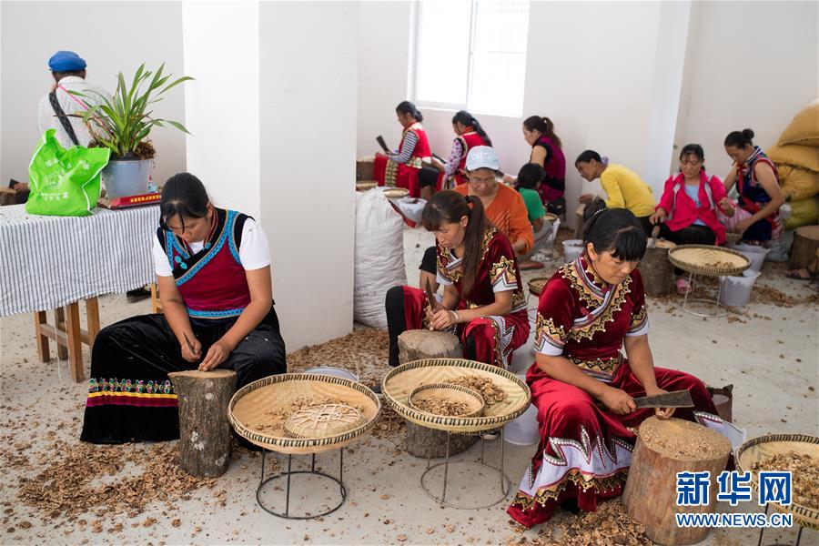 在大興地鎮(zhèn)維拉壩“珠海小區(qū)”內(nèi)的農(nóng)產(chǎn)品加工扶貧車間,村民們?cè)趧兒颂胰剩?月24日攝)。新華社記者胡超攝