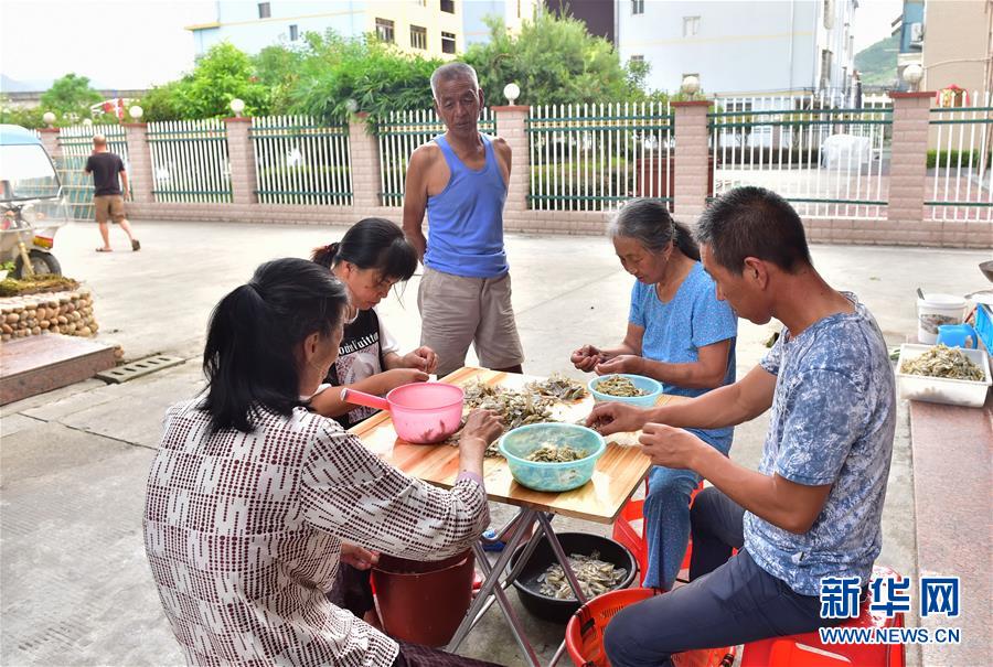 8月21日,福安市溪邳村村民在家門前加工海蟶。新華社記者林善傳攝