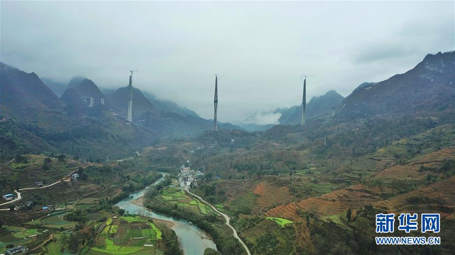 2019年1月7日無人機(jī)航拍的平塘特大橋橋塔全景,中為高332米的世界第一高混凝土橋塔。新華社記者歐東衢攝