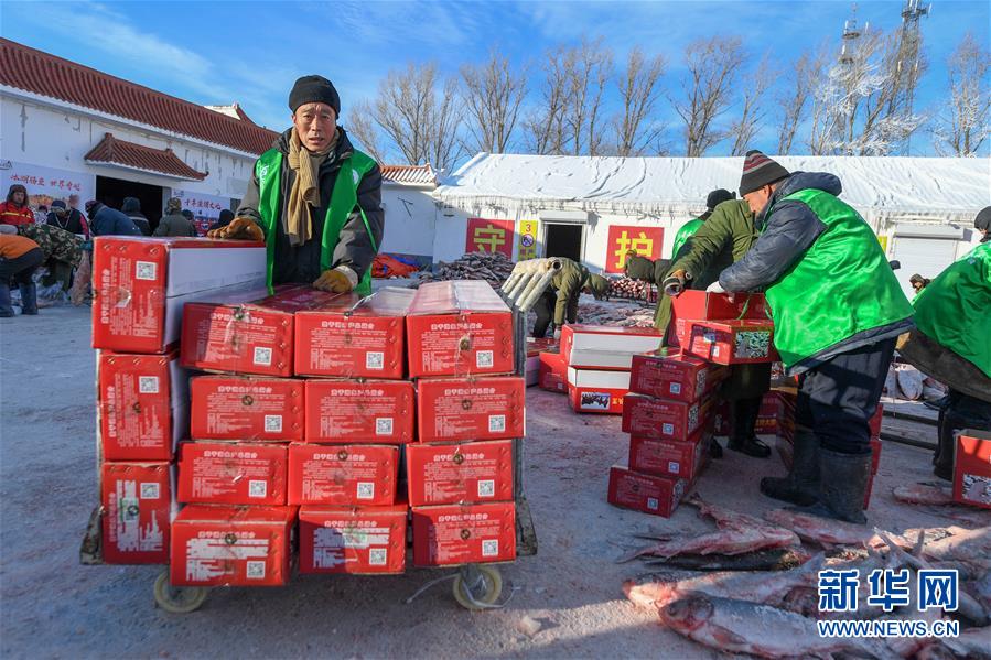 12月27日,在吉林松原查干湖漁場,工人們將魚裝箱。新華社記者張楠攝