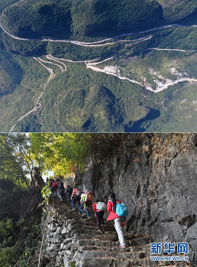 拼版照片:上圖為大化瑤族自治縣七百弄鄉(xiāng)弄良村弄丘屯剛剛修通的公路(右下段)和村道、鄉(xiāng)道連接(11月12日無人機(jī)拍攝);下圖為在尚未通路的弄良村弄丘屯,孩子們爬“天梯”回家(2016年12月9日攝)。新華社記者黃孝邦攝