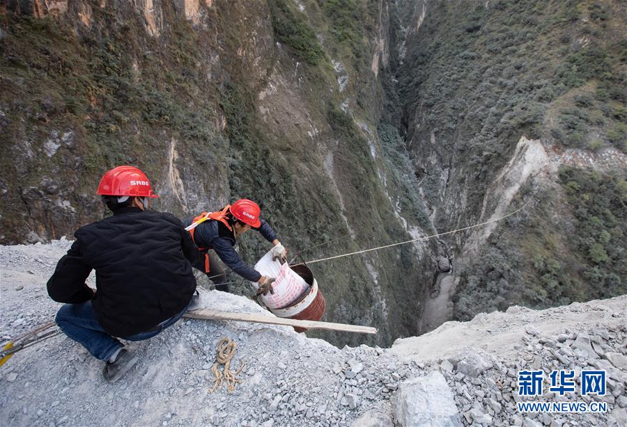 四川路橋的施工人員通過(guò)臨時(shí)搭建的溜索運(yùn)輸施工物資到峽谷對(duì)岸(2019年11月20日攝)。阿布洛哈村通村公路施工遇到陡崖夾溝地勢(shì),項(xiàng)目進(jìn)程艱難緩慢,四川路橋施工隊(duì)伍開始在峽谷兩端分頭推進(jìn)。新華社記者江宏景攝