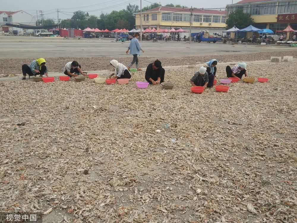 2019年9月13日,農(nóng)歷八月十五中秋節(jié),山東濱州沾化區(qū)魯北海產(chǎn)品批發(fā)市場,村民正在分揀貨物。