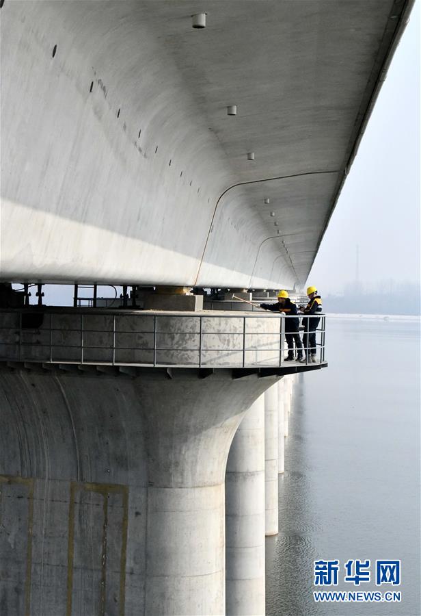 1月3日,中國鐵路濟南局臨沂工務段工程技術員在沂河特大橋橋墩上檢查。新華社記者 朱崢攝