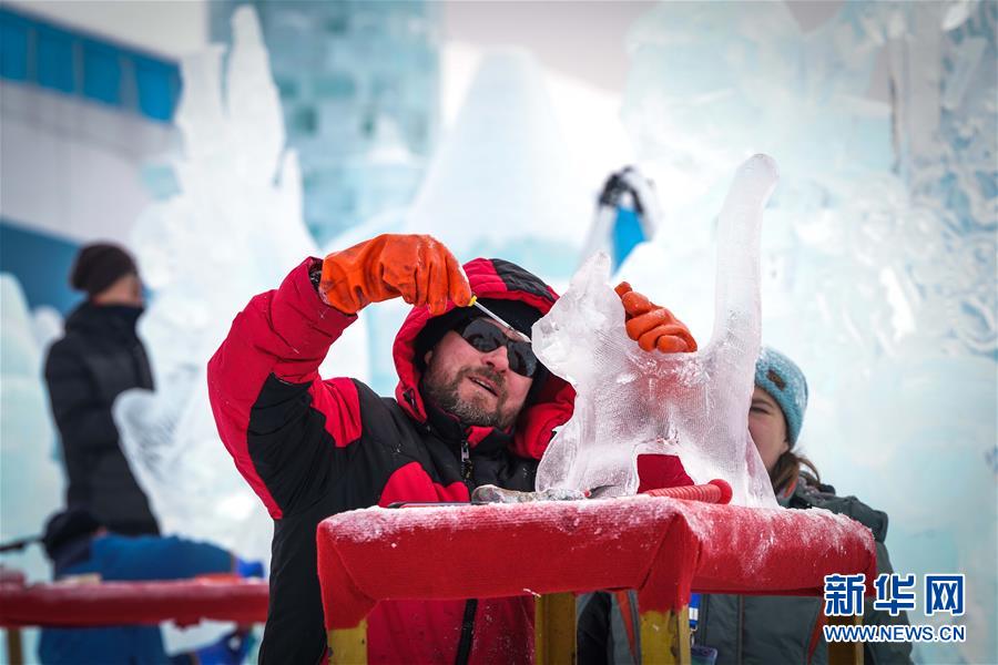 冰雕師在哈爾濱冰雪大世界內(nèi)雕刻冰雕作品(1月8日攝)。新華社記者王松攝