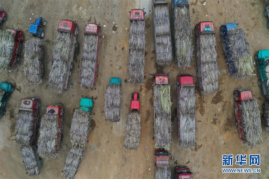 1月13日,運(yùn)蔗車輛排隊進(jìn)入鹿寨縣一家制糖企業(yè)(無人機(jī)照片)。新華社記者黃孝邦攝