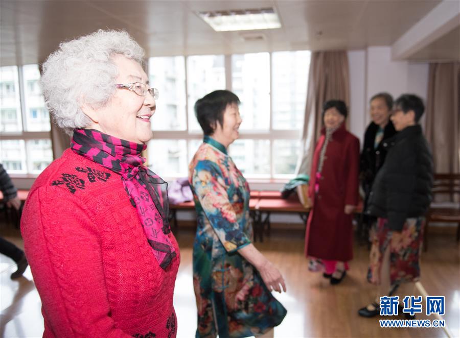 1月17日,王育華(前)向杭州市社會福利中心模特隊(duì)的一名隊(duì)員學(xué)習(xí)走臺步。新華社記者 翁忻旸 攝