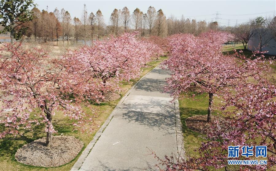 這是2月24日在上海松江辰山植物園內拍攝的櫻花小徑(無人機照片)。 新華社記者 方喆 攝