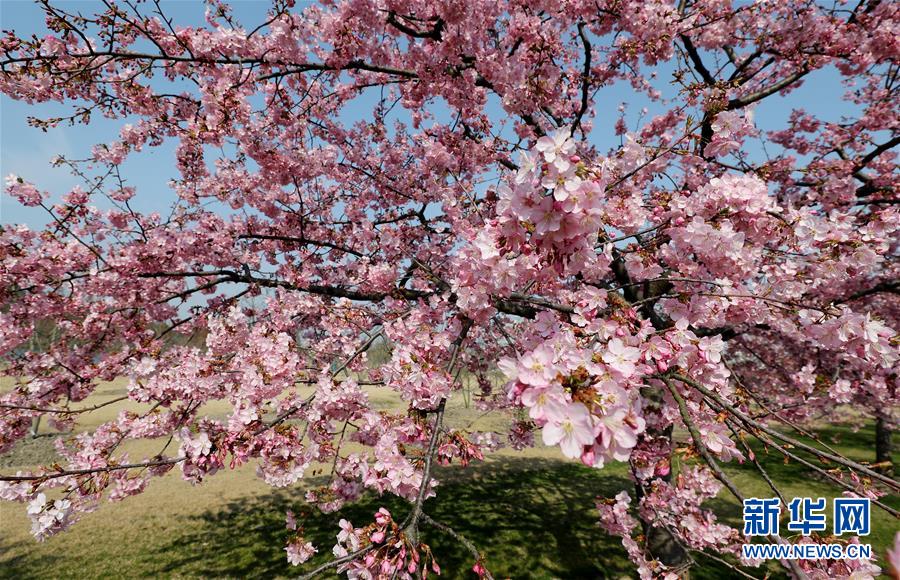 2月24日,蜜蜂在上海松江辰山植物園內盛開的河津櫻櫻花叢中飛舞。近日,上海松江區(qū)辰山植物園內的河津櫻絢麗綻放,花團錦簇間一派盎然春意。 新華社記者 方喆 攝