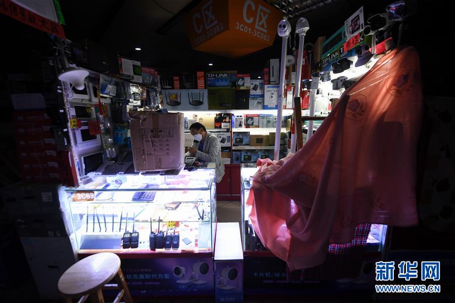 2月24日,在深圳華強(qiáng)北暫未完全開(kāi)放的賽格電子市場(chǎng)里,商戶在與客戶打電話。 新華社記者 毛思倩 攝