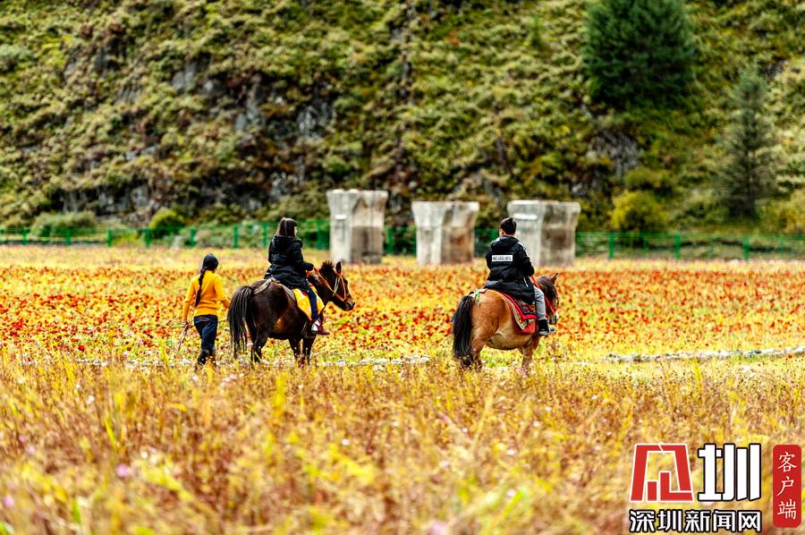 神奇的光線,無(wú)垠的草原,彎彎的小溪,金黃的柏楊,山巒連綿起伏,藏寨散落其間,牛羊安詳?shù)爻圆荨?/p>