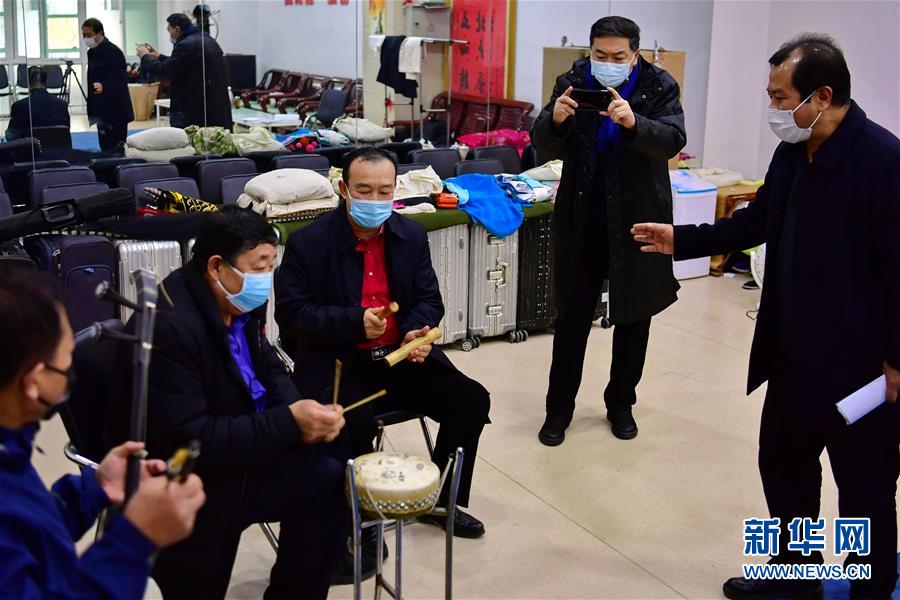 太原市晉劇藝術(shù)研究院的工作人員在為戲迷直播武凌云(左二)排練晉劇(3月9日攝)。 新華社記者 曹陽(yáng) 攝