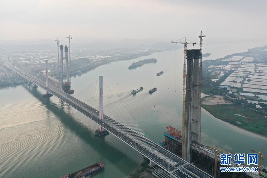 3月18日拍攝的廣州南沙港鐵路跨西江斜拉橋主塔封頂施工現(xiàn)場(無人機(jī)照片)。當(dāng)日,中鐵十一局承建的粵港澳大灣區(qū)重點(diǎn)工程——廣州南沙港鐵路跨西江斜拉橋主塔封頂,大橋整體建設(shè)取得重要進(jìn)展。該橋位于廣東佛山市和江門市交界處,全長1117.5米。新華社記者劉大偉攝