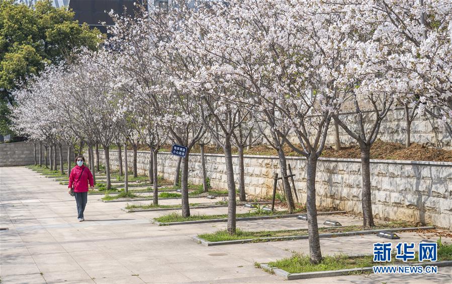 3月19日,在武漢市武昌區(qū)被網(wǎng)友稱為“武漢最美停車場”的湖北日報停車場,一名工作人員從櫻花樹邊經(jīng)過。 新華社記者 才揚 攝