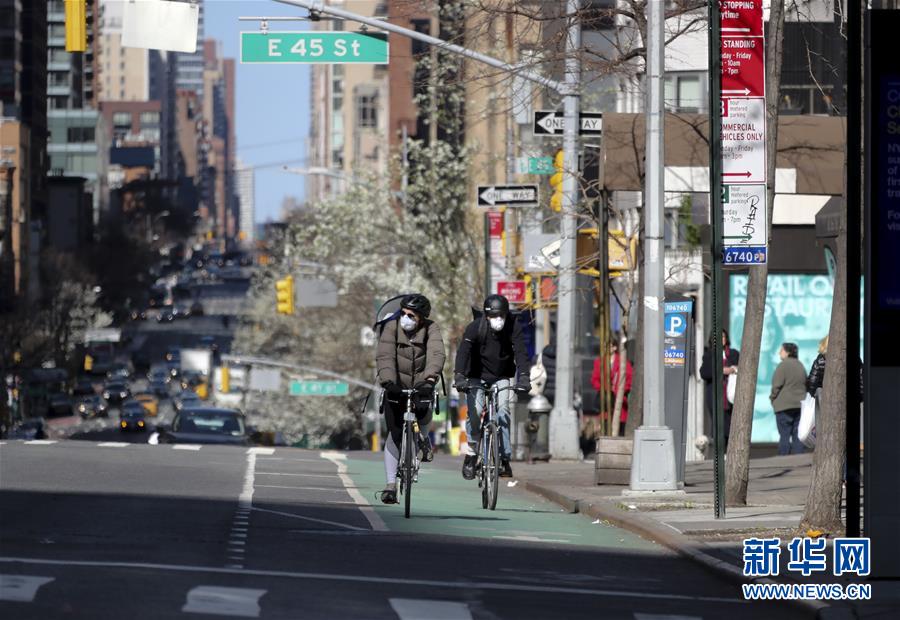 3月21日,在美國紐約第二大道,人們戴口罩騎車出行。美國紐約州、伊利諾伊州、康涅狄格州20日發(fā)布針對(duì)本州居民的“居家令”,以遏制新冠病毒傳播。這些“居家令”涵蓋紐約、洛杉磯、芝加哥等大城市,影響數(shù)千萬人。白宮20日發(fā)表聲明說,總統(tǒng)特朗普已宣布紐約州出現(xiàn)“重大災(zāi)難”,命令聯(lián)邦政府支援該州抗擊新冠肺炎疫情。新華社記者王迎攝