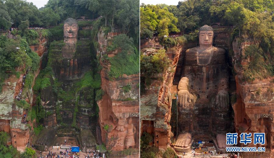 這是一張拼版照片:左圖為體檢與搶救性修復(fù)工作前的樂山大佛(2018年10月4日無人機拍攝);右圖為體檢與搶救性修復(fù)工作后的樂山大佛(3月29日無人機拍攝)。新華社記者江宏景攝