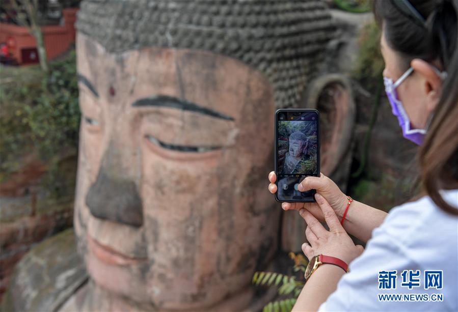 3月23日,一位游客在樂山大佛景區(qū)內(nèi)用手機拍攝。新華社記者張超群攝