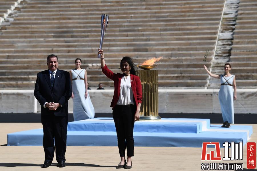 3月19日,日本代表團成員井本直步子(右)從希臘奧委會主席斯皮羅斯·卡普拉洛斯手中接過東京奧運會圣火火炬。