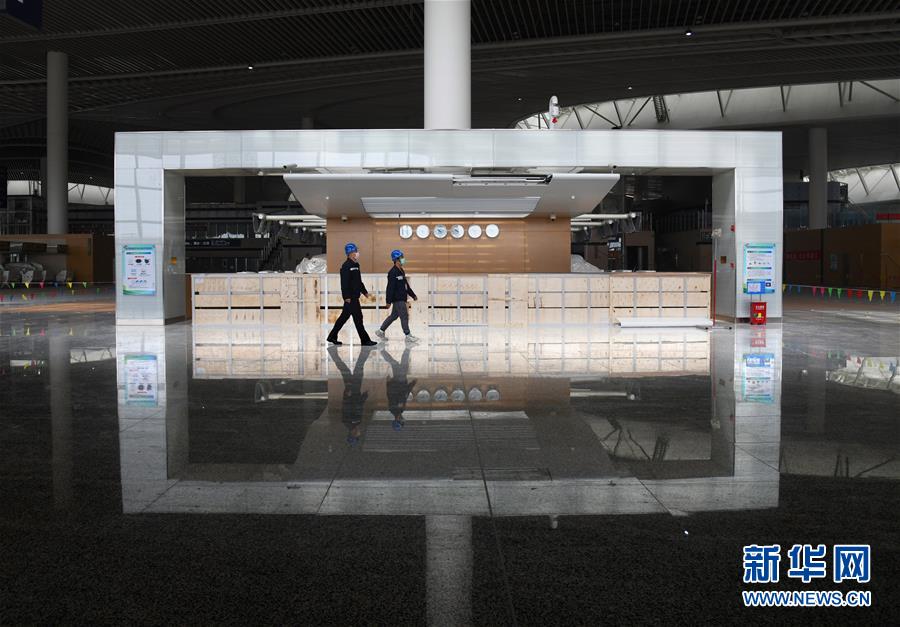 3月25日,兩名工程技術(shù)人員從建設(shè)中的青島膠東國際機場航站樓出發(fā)大廳走過。新華社記者李紫恒攝