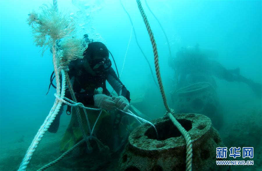 3月28日,在位于海南三亞蜈支洲島旅游區(qū)的海洋牧場,工作人員在海底用繩子綁住人工魚礁,準備進行吊裝擺位作業(yè)。近日,位于海南三亞蜈支洲島旅游區(qū)的海洋牧場復工,海底作業(yè)逐漸恢復正常,開始進行人工魚礁吊裝擺位、水下監(jiān)控清理以及日常巡護等工作。據(jù)介紹,人工魚礁有利于魚類種類增加和數(shù)量提高,蜈支洲島海域海洋牧場人工魚礁表面附著珊瑚、貝類、藻類等生物種類達120余種。新華社記者楊冠宇攝