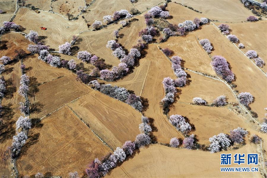 西藏林芝市波密縣境內(nèi)桃花盛開的田園風光(無人機照片,3月26日攝)。新華社記者 詹彥 攝