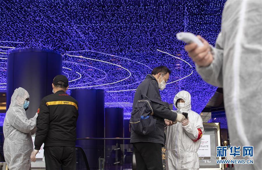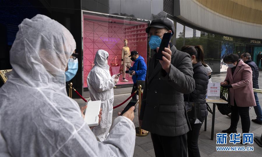 3月30日,在武商國(guó)際廣場(chǎng)的超市前,工作人員測(cè)量顧客的體溫、查看健康碼。當(dāng)日,武漢市多家商場(chǎng)開門迎客。新華社記者費(fèi)茂華攝