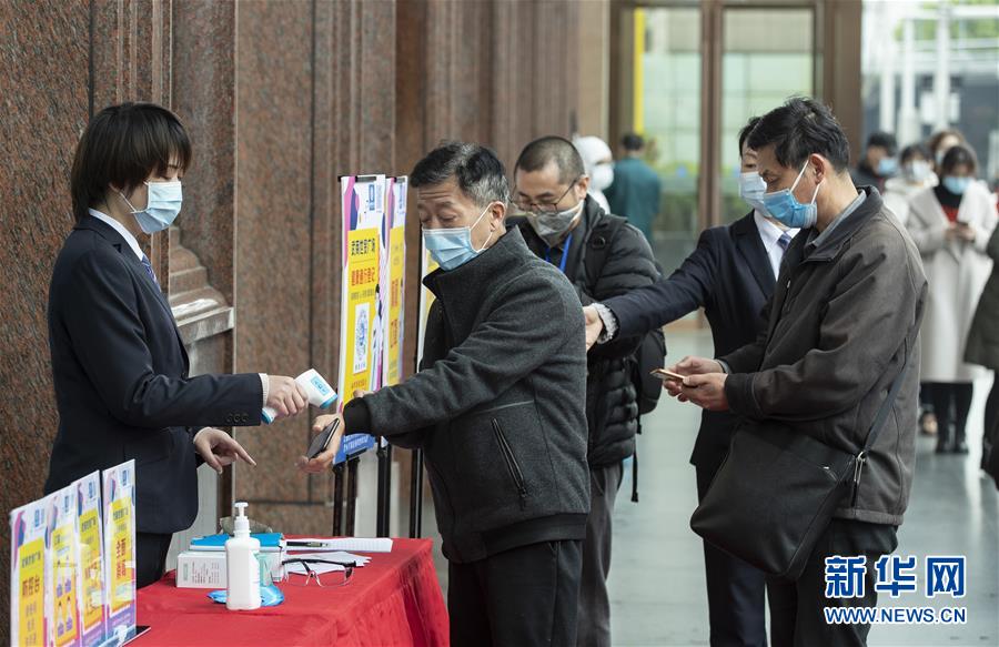 3月30日,在武商國(guó)際廣場(chǎng)的超市門口,工作人員在測(cè)量顧客的體溫。當(dāng)日,武漢市多家商場(chǎng)開門迎客。新華社記者費(fèi)茂華攝