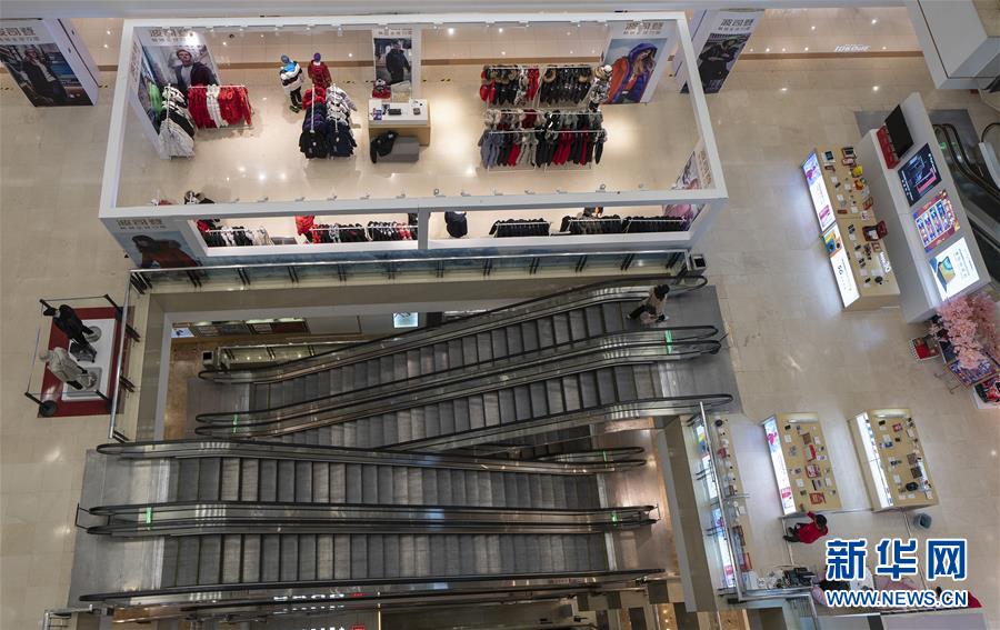 3月30日,在武商世貿(mào)廣場(chǎng),一位顧客乘坐滾梯。當(dāng)日,武漢市多家商場(chǎng)開門迎客。新華社記者費(fèi)茂華攝