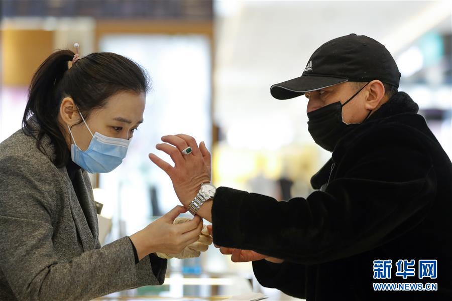 3月30日,在武漢市武商世貿(mào)廣場(chǎng),一名顧客(右)在挑選手表。當(dāng)日,武漢市多家商場(chǎng)開門迎客。新華社記者沈伯韓攝