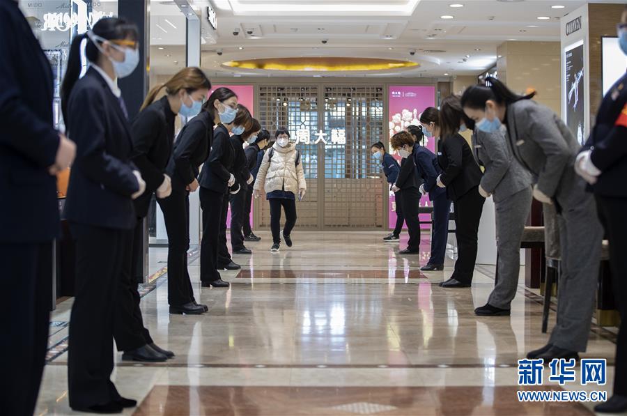 3月30日,在武商世貿(mào)廣場(chǎng),工作人員歡迎顧客進(jìn)入。當(dāng)日,武漢市多家商場(chǎng)開門迎客。新華社記者費(fèi)茂華攝
